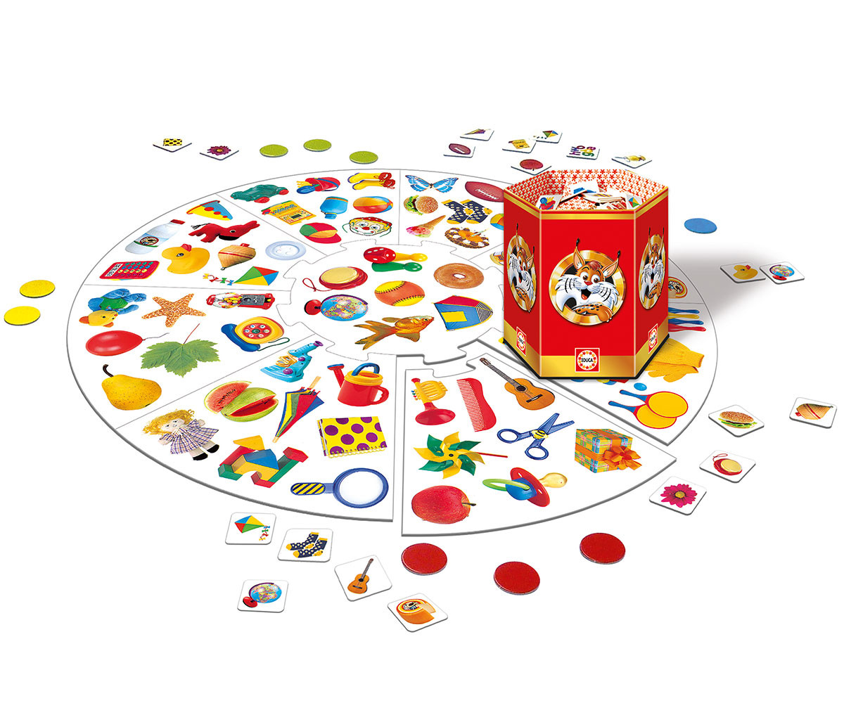 - 1 дъска с 9 части, 70 карти с изображения, 12 цветни чипа, 1 сгъваема кутия, инструкции.