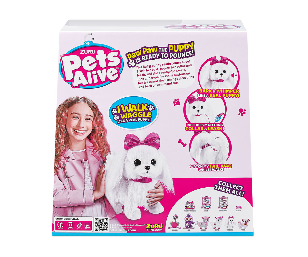 Кое е най-пухкавото, най-сладкото и най-бляскавото кученце на света? Разбира се, че е Lil' Paw Paw! Този перфектен, обичан класически дизайн с модерен привкус се присъединява към семейството на Pets Alive. Копринено гладката козина на това великолепно кученце е създадена за разресване и гушкане, а нейните блестящи сини очи блестят почти толкова, колкото идеално розовата й панделка и яка. Lil' Paw Paw върви напред, за да я покаже на всички ваши приятели! Гледайте как лае като истинско кученце! Използвайте каишката за лесно управление, за да контролирате ходенето и лаенето на Lil' Paw Paw.