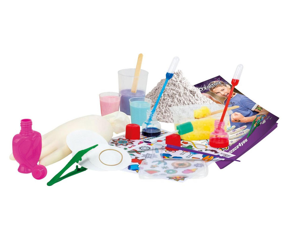 - Образователна книжка с 36 страници; Хартиени филтри; Ръкавица; Гумена лента; Малки мерителни чашки; Голяма мерителна чаша; Пастьорови пипети; Дървени шпатули; Трансферни татуировки; Четка за рисуване; Гъба; Синьо козметично оцветяване; Розово козметично оцветяване; Контейнер с капак; Бутилка във формата на сърце; Пинсета; Гипс.