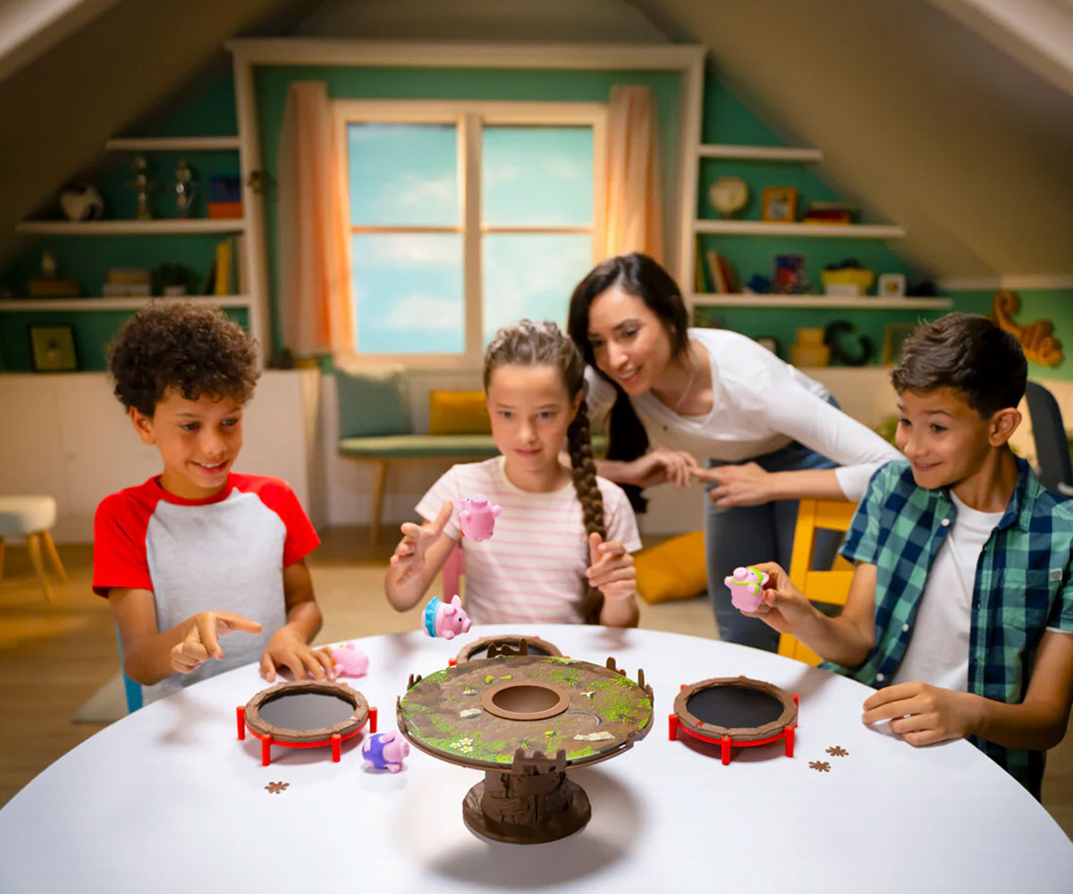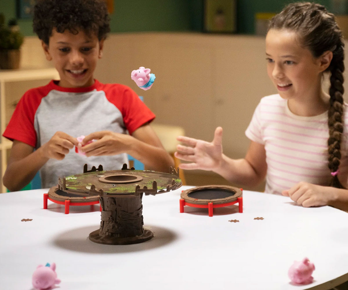 Юпииии! Скачайте от радост с прасета на транмплин! Бройте до 3, и на 3 всеки започва да изстрелва своите прасенца от трамплина, за да ги изпрати в калната яма. Не се опитвайте да следите кой с кое прасенце е започнал (хванете, това прасенце, което се окаже най-близо до вас и продължавайте да ги изстрелвате едно след друго) - веднъж започнала играта, всеки се опитва да кацне на платформата. Ако някой от играчите успее да приземи едно от своите прасенца в калната яма, играта спира, за да се извади прасенцето и да се вземе един кален пай. Уверете се, че всеки играч отново има еднакъв брой прасенца в готовност. Бройте отново до 3 и започнете играта, като се опитвате да вкарате прасенцата в калната яма! След взимането на всичките пайове от калната локва, играта приключва. Съберете своите пайове, победителят е най-калното прасенце! Нулирайте играта като върнете пайовете в калната яма и играйте отново!