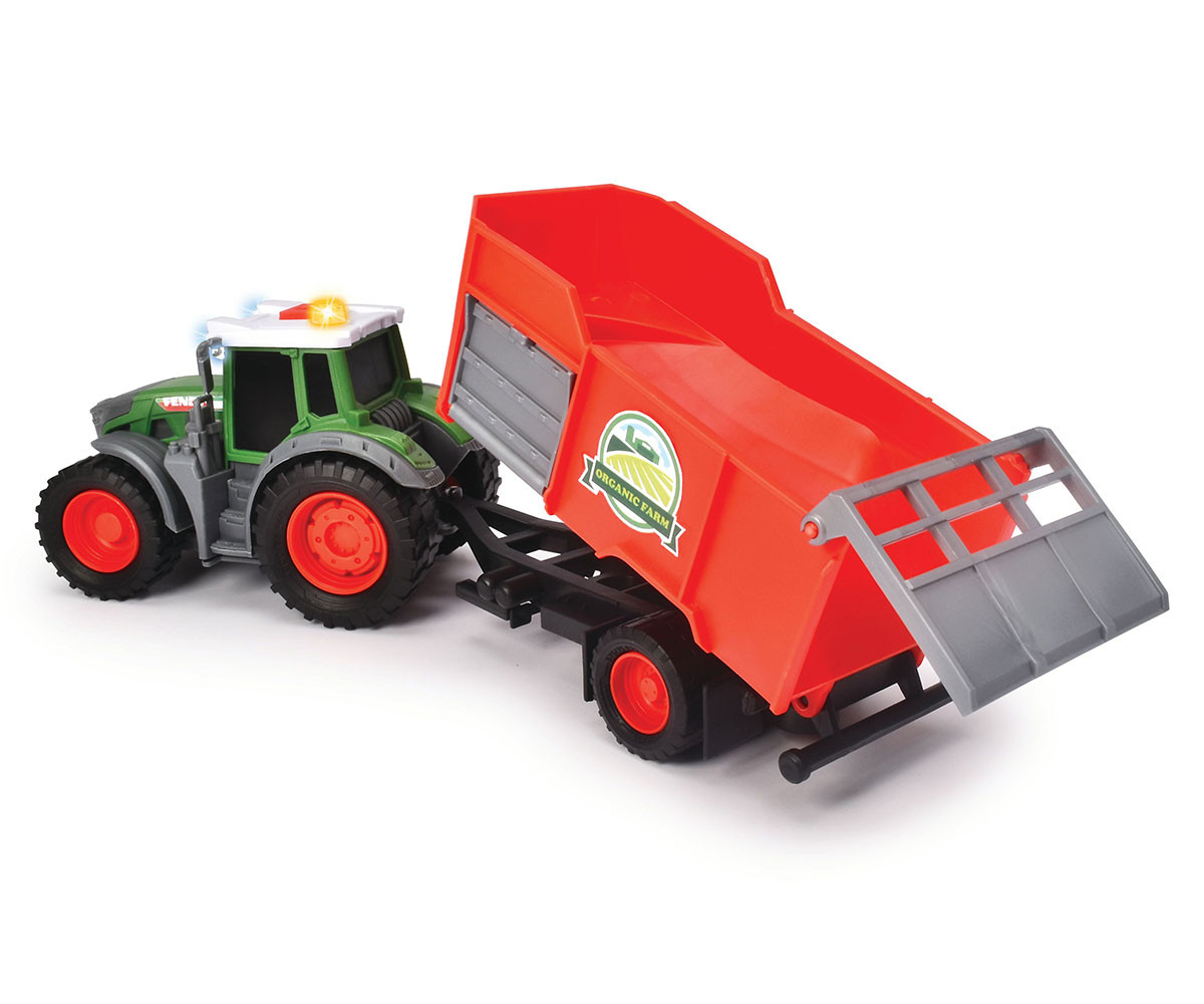 Трактор играчка за деца на 3 и повече години с въртящи се колела, светлинни и звукови ефекти и други функции, включва играчка бала сено. Започнете да работите във фермата с трактора с ремарке Fendt от Dickie Toys! Този трактор с голямо ремарке е задължителен за всяка ферма. Притежава официален лиценз на Fendt и е перфектен подарък за всички фенове на модели превозни средства. Ярки цветове и сложен детайлен дизайн, шикозното превозно средство има и широка гама от забавни функции. Акцентите включват светлинни и звукови ефекти и въртящи се колела, както и ремарке с функция за накланяне. Големите, широки гуми осигуряват много сцепление, за да се гарантира, че тракторът няма да се отклони от курса. Комплектът включва също бала играчка сено и идва с батерии, за да можете веднага да се захванете за работа!