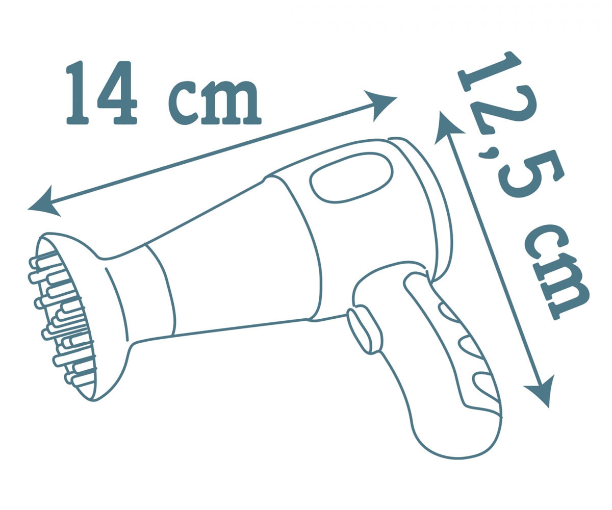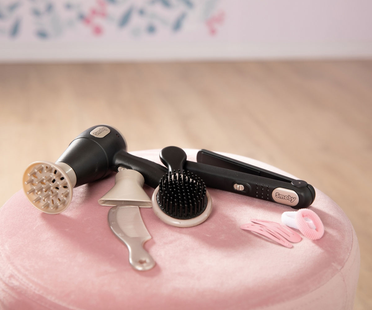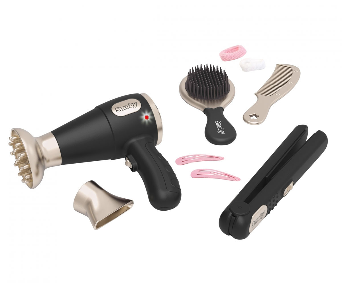 Всичко, от което се нуждаете, за да оформите косата си: 1 електронен сешоар с 2 накрайника, 1 преса за коса, 1 четка, 1 гребен, 2 ластика за коса и 2 фиби. Сешоарът разполага със звукови и светлинни функции, точно като истински!