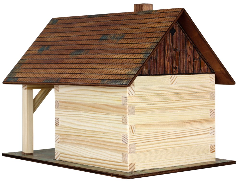 Комплект-конструктор за изграждане на миниатюрна традиционна сграда от истински дървени трупи. Този 3D комплект за дърводелство се предлага с дървени блокове с различни дължини, строителни части за конструкцията на покрив, прозорци, врати, други компоненти и стъпка по стъпка инструкции за диаграма, т.е. пиктограми, със символи за отделни работни действия.Необходимо е лепило за дърво,което не е включено в комплекта.