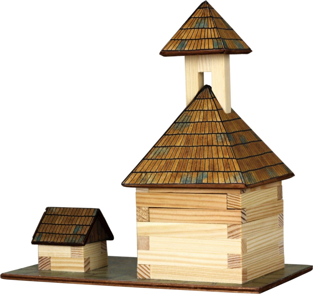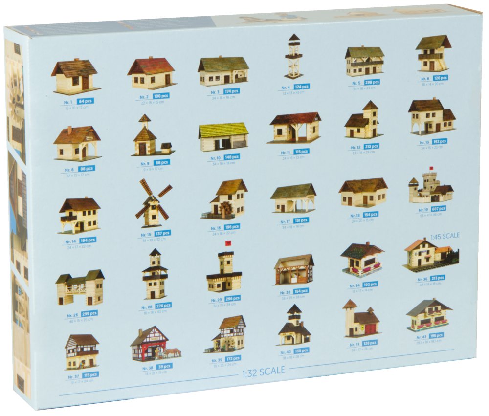 Комплект-конструктор за изграждане на миниатюрна традиционна сграда от истински дървени трупи. Този 3D комплект за дърводелство се предлага с дървени блокове с различни дължини, строителни части за конструкцията на покрив, прозорци, врати, други компоненти и стъпка по стъпка инструкции за диаграма, т.е. пиктограми, със символи за отделни работни действия.Необходимо е лепило за дърво,което не е включено в комплекта.