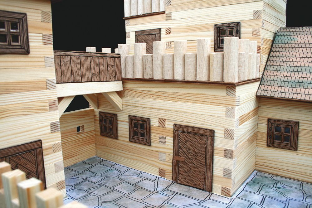 Комплект-конструктор за изграждане на миниатюрна традиционна сграда от истински дървени трупи. Този 3D комплект за дърводелство се предлага с дървени блокове с различни дължини, строителни части за конструкцията на покрив, прозорци, врати, други компоненти и стъпка по стъпка инструкции за диаграма, т.е. пиктограми, със символи за отделни работни действия.Необходимо е лепило за дърво,което не е включено в комплекта.