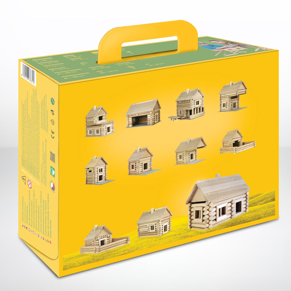Комплект-конструктор VARIO включва сглобени и демонтирани модели на сгради, изработени от букови трупи с диаметър 15 мм, с дължини от 28 до 250 мм, с полукръгли ключалки. Те са съвместими помежду си и ви позволяват да изградите десетки варианти на конструкциите. Прозорците и вратите са залепени заедно от масивните профили, вмъкнати в стените на сградите.